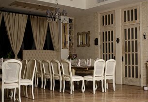 Интерьер ресторана выполнен в стиле прованс — светлый деревянный пол, мягкие диваны и удобные кресла, буфеты из беленого дуба и обилие изысканных дизайнерских акцентов. Спокойный, мягкий, теплый интерьер с использованием натуральных материалов и дизайнерских элементов подойдет также для деловых встреч и романтических ужинов.